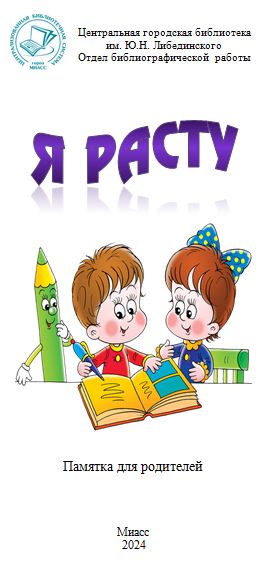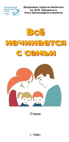 Малые формы информационно-библиографической печатной продукции представлены буклетами «Родительский день» (о Международном дне родителей), «Семейный отдых. Отдыхаем активно», «Семейный отдых. Музеи. Парки» (подскажут куда можно пойти всей семьёй в Миассе), памяткой с простыми советами для родителей «Я расту», закладками «Всё начинается с семьи» (стихи о семье).