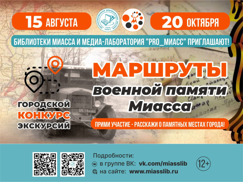 Библиотеки Миасса и медиа-лаборатория «PRO_Миасс» приглашают стать участниками уникального творческого состязания — Конкурса экскурсий «Маршруты военной памяти Миасса». Этот проект направлен на сохранение памяти о событиях Великой Отечественной войны и возрождение интереса молодого поколения к изучению героического наследия родного края.