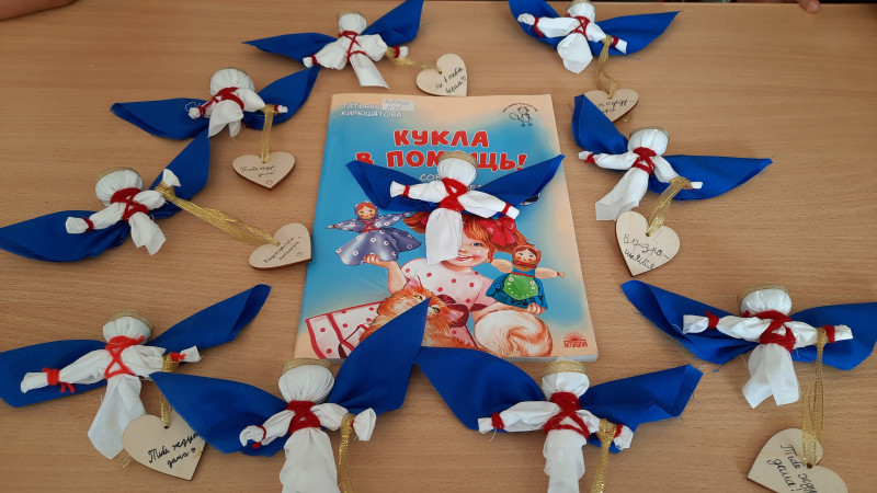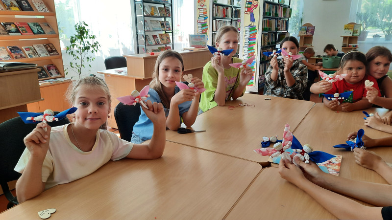 А ещё каждое лето одно из занятий посвящено тряпичным куклам. В этом году мы делали обережную куклу Ангел. Их было сделано две. Одну ребята забрали домой, а вторую с добрыми пожеланиями на сердечках мы бережно упаковали, и в ближайшее время они будут переданы представителям общественно-патриотической организации «ZOV Миасса».