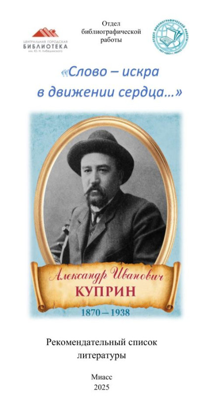 «Слово — искра в движении сердца…»: А.И.Куприн (1870-1938): рекомендательный список / составитель О.Б.Шакирова. — Миасс: МКУ ЦБС, 2025. — 2 с. — Текст: электронный
