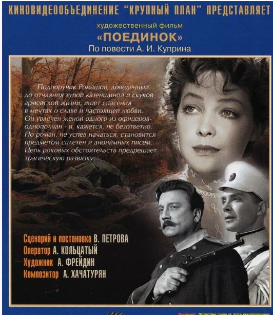 Выпускник престижного Александровского военного училища , он написал повесть «Поединок», где описана армейская жизнь с её непонятными уставами и самодурством высших чинов. Однако автор отнюдь не преувеличивал, повесть во многом автобиографична. В её основе личные впечатления Куприна, который четыре года офицером проходил службу в захолустном городке Подольской губернии. Автор описывает типичный быт российской армии: замордованные солдаты и побаивающиеся офицеров обыватели. А сами офицеры? Пьют, гуляют, играют в карты, скандалят. Несладко приходится и их женам. Выходя за офицера, любая девушка мечтает о счастье, об обожании, о защите, верит в прекрасное будущее. А тут… На фоне пьянства, разврата и недалёкой армейской жизни вырисовывается всего один светлый, романтичный образ — офицера Ромашова. Но Ромашов — трус, не способный защитить любимую женщину от мерзостей быта. Единственное, что может выдумать – погибнуть во имя любви. Как глупо! Или всё же романтично? Повесть встретила восторженные отзывы писателей: М. Горького, К. Паустовского и многих других. Однако большинство современников автора восприняли это произведение как клевету. И больше всего ему досталось от военных. Эта история о безнадежной любви в безнадежной ситуации 6 раз экранизирована, в том числе в 1910 году, ещё при жизни Куприна, режиссером Андре Мэтром