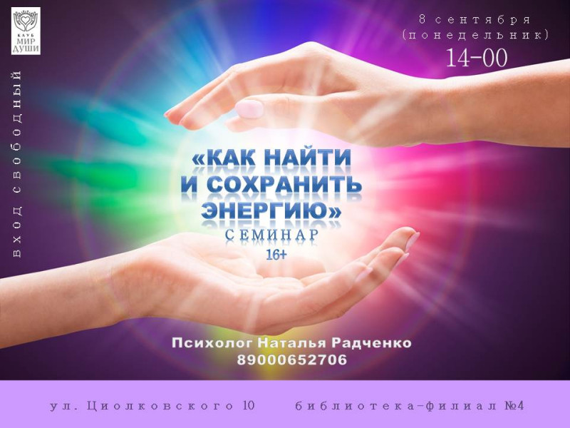 На очередной встрече с участниками клуба «Мир души», психолог Наталья Радченко даст рекомендации, как накопить достаточно жизненной энергии и отлично себя чувствовать.