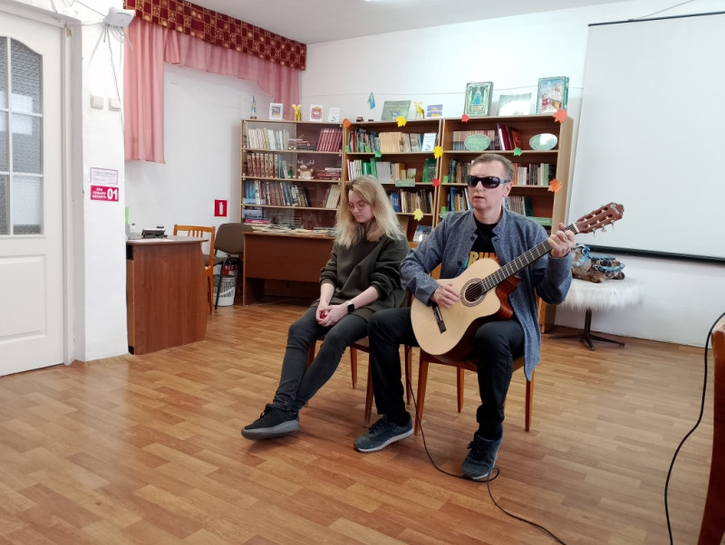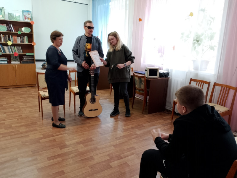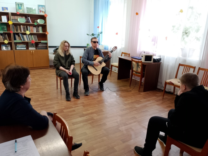 В библиотеке-филиале №15 (ул.Орловская, 34) прошло мероприятие, посвящённое Дню белой трости. Встреча семиклассников школы 30 с известным в городе музыкантом, исполнителем своих песен Тимуром Хасаншиным и барабанщицей, преподавателем студии Дарьей Савитной.