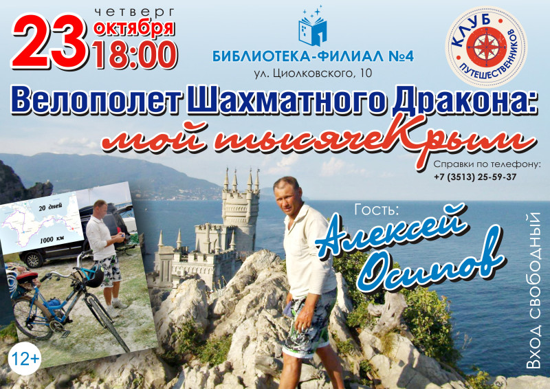 23 октября (четверг) в 18.00 библиотека-филиал №4 приглашает на очередное заседание Клуба путешественников «Велополёт Шахматного Дракона: мой тысячеКрым».