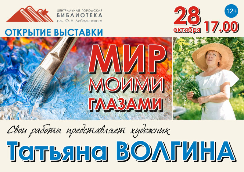 Друзья, 28 октября в Центральной городской библиотеке им. Ю.Н. Либединского состоится открытие выставки «Мир моими глазами» художницы Татьяны Волгиной. Татьяна Юрьевна больше 10 лет занимется в художественной галерее «Шедевр». Ее учителя — преподаватели Ксения Гончарова и Владимир Горбунов.