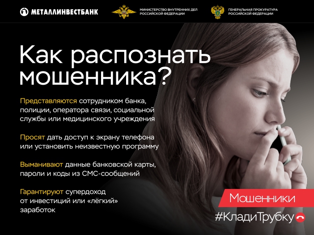 Запомните! Никогда не сообщайте личные данные, пароли и реквизиты банковских карт по телефону! Если вам предлагают перевести ваши деньги “на безопасный счёт” — прекращайте разговор немедленно!