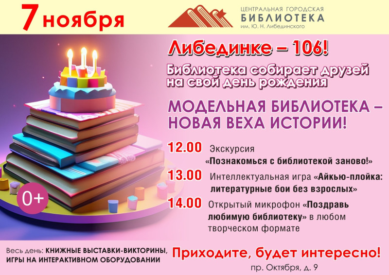 7 ноября приглашаем вас отметить 106-летие Центральной городской библиотеки им. Ю. Н. Либединского!