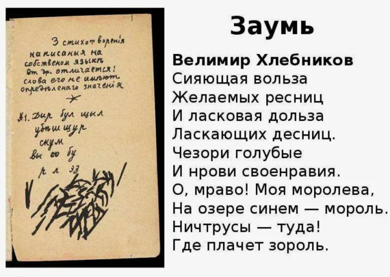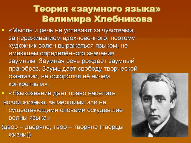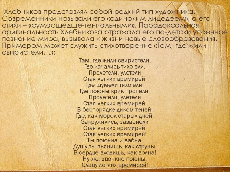 В начале XX века Велимир Хлебников (настоящее имя — Виктор Владимирович Хлебников) вошёл в круг русских футуристов, его называли «председатель земного шара» – за стремление мыслить масштабами человечества. В поэзии он экспериментировал со звуками, придумывал неологизмы, создавал так называемый «заумный язык».