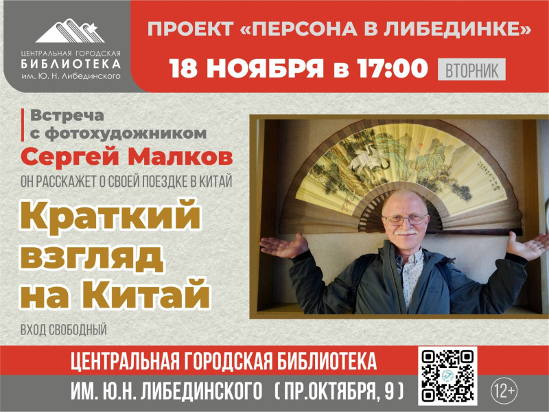 Во вторник, 18 ноября, в центральной городской библиотеке им. Ю.Н. Либединского Сергей Владимирович расскажет о своём путешествии в Китай, которое он совершил в этом году, покажет интереснейшие фотографии, поделится впечатлениями.
