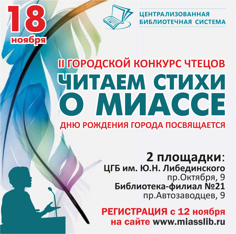 Библиотеки Миасса в преддверии Дня рождения города объявляют о проведении II городского конкурса чтецов «Читаем стихи о Миассе», который пройдет в знаменательный для города день, 18 ноября  2025 года, сразу на двух площадках. Чтецов ждут в Центральной городской библиотеке им. Ю. Н. Либединского (пр. Октября,  9) и в библиотеке-филиале № 21 ЛиТеРа (пр. Автозаводцев, 9). Время проведения конкурса с 14.00 до 16.00  часов.
