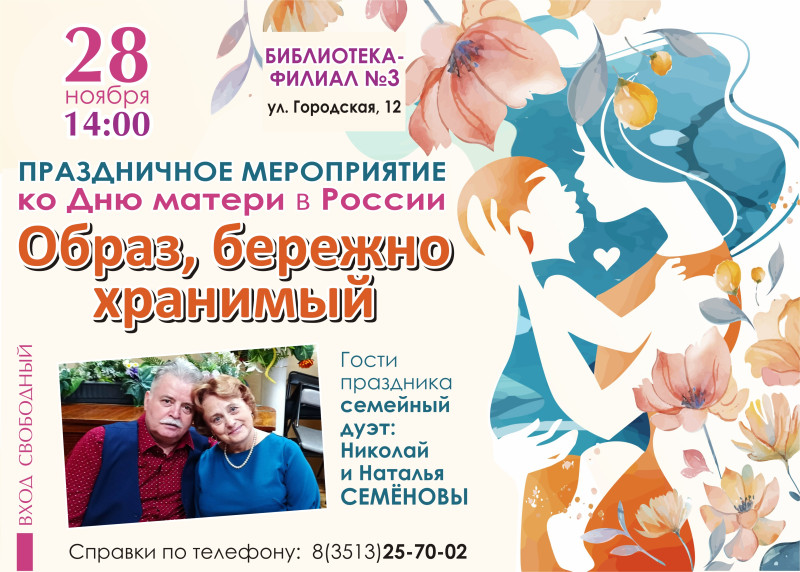 Библиотека-филиал №3 (ул. Городская, 12) приглашает на праздничное мероприятие «Образ, бережно хранимый», посвящённое Дню матерей России.