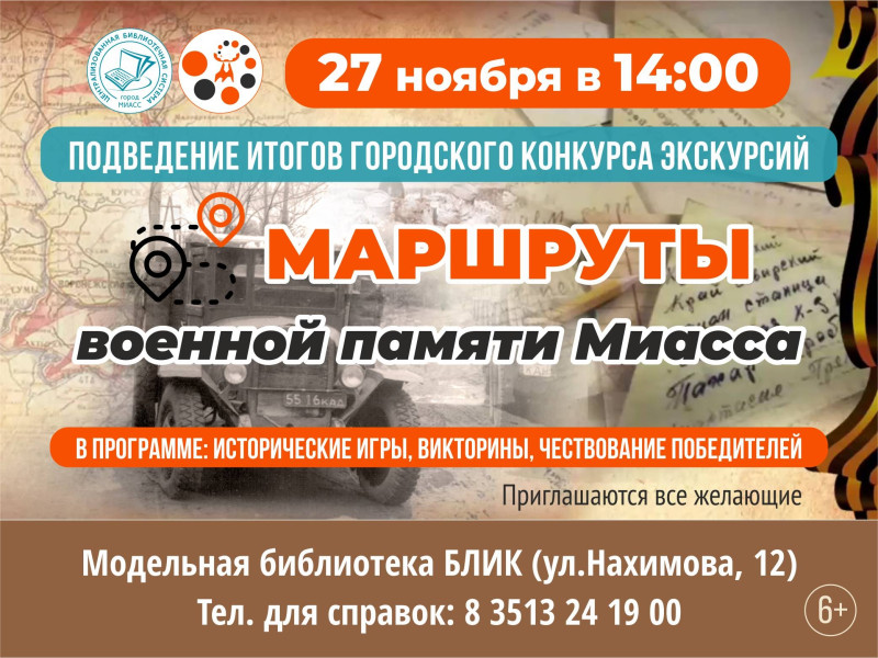 Модельная библиотека №6 БЛИК приглашает на подведение итогов Городского конкурса экскурсий «Маршруты военной памяти Миасса»