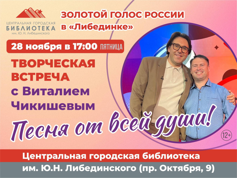 Друзья, в пятницу, 28 ноября в 17:00 в модельной центральой городской библиотеке им. Ю.Н. Либединского состоится творческая встреча с Виталием Чикишевым «Песня от всей души». ⠀
