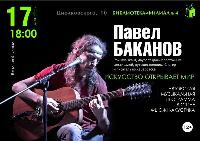 17 декабря (среда) в 18:00 в библиотеке-филиале №4 выступит Павел Баканов, автор-исполнитель, рок-музыкант, лауреат дальневосточных фестивалей, проехавший с концертами несколько стран, блогер, писатель из Хабаровска с авторской музыкальной программой.