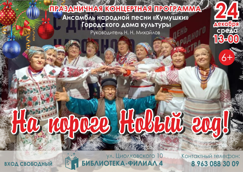 Дорогие друзья! 24 декабря, в преддверии самого волшебного праздника, библиотека-филиал №4 (ул. Циолковского, 10) приглашает вас принять участие в праздничной концертной программе «На пороге Новый год!». Для вас выступит ансамбль народной песни «Кумушки» Городского дома культуры, руководитель Н. Н. Михайлов.