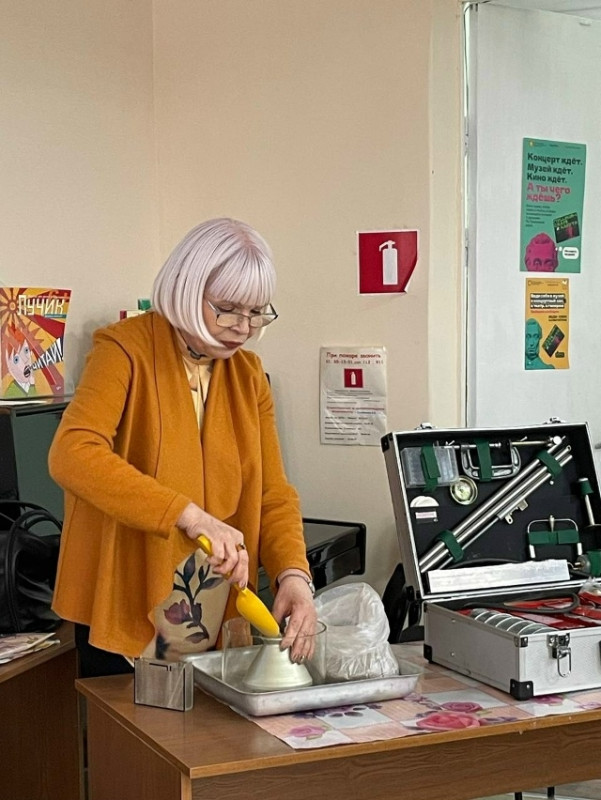 С помощью полевого чемоданчика, в котором были набор грунтов, линеек и уровней Галина Юрьевна продемонстрировала, как геологи в полевых условиях определяют устойчивость склонов.