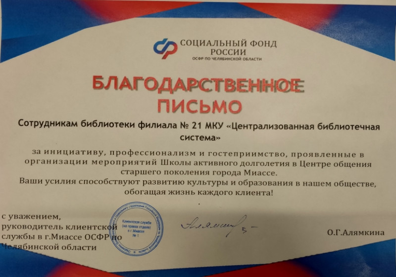 Руководитель клиентской службы отделения Социального фонда Российской Федерации в г. Миасс Оксана Алямкина поблагодарила библиотеку «ЛиТеРа» за сотрудничество.