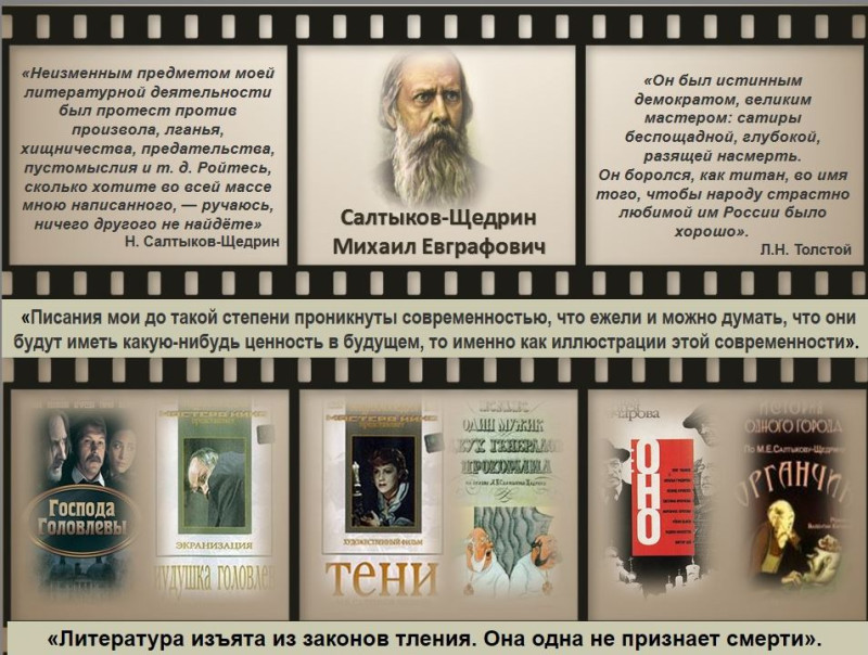 Однако литература – не зеркало, в котором отражаются одни недостатки и грехи. Это знал и сам М.Е. Салтыков – Щедрин. «Везде литература ценится не на основании гнуснейших её образцов, а на основании тех её деятелей, которые воистину ведут общество вперёд», — писал он. И ещё: «Писатель, которого сердце не переболело всеми болями того общества, в котором он действует, едва ли может претендовать в литературе на значение выше посредственного и очень скоропреходящего».