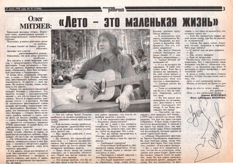 Безрученко, М. Олег Митяев: «Лето – это маленькая жизнь» / М. Безрученко // Миасский рабочий. – 1998. – 27 июня – С. 3.