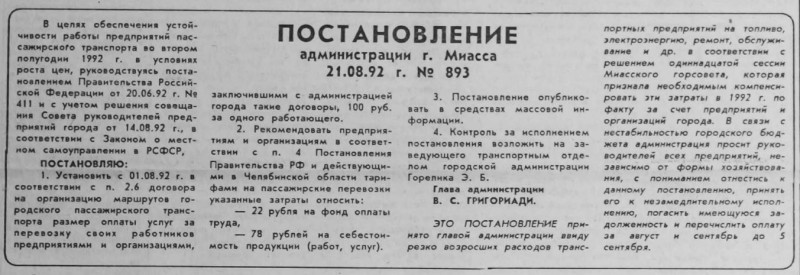 Глава администрации Миасского городского округа. «О безабонементном проезде в городском транспорте». — Текст : непосредственный // Миасский рабочий. — 1999. — 7 января. — С. 1, 2.