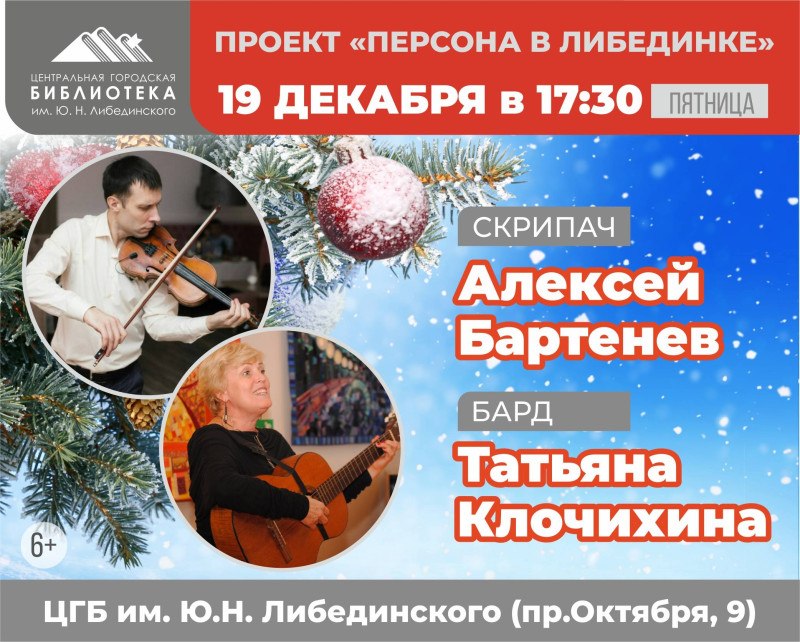 Друзья, приглашаем на творческую встречу в ЦГБ им Ю.Н. Либединского. В рамках проекта «Персона в «Либединке» для вас выступят скрипач Алексей Бартенев и бард Татьяна Клочихина. Гости исполнят интереснейшие музыкальные произведения, популярные авторские песни.