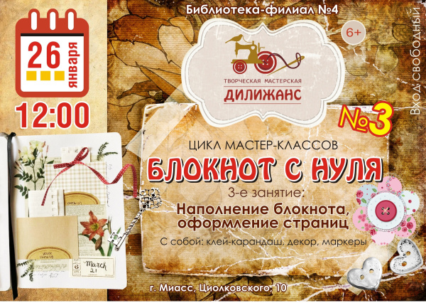 Ждём вас в библиотеке-филиале № 4 26 января в 12.00 по адресу: ул. Циолковского, 10.
