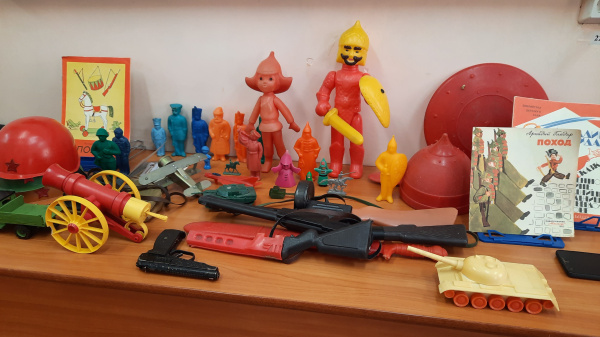 Гостья привезла с собой небольшую часть экспонатов музея, отражающих военные страницы истории нашей страны: солдатики разных эпох, мечи и щиты, шлемы и каски, танки и военные автомобили. Ребята могли всё это потрогать, примерить и сфотографироваться с любым из предметов, что вызвало неподдельный интерес.