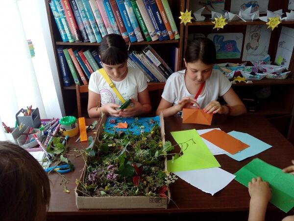 3 августа ребята решили сделать свой лесной уголок. Дети вместе с библиотекарем Марией Александровной Дмитриевой отправились собирать декорации (листики, цветы, мох, берёзки, травки, камни). Вернувшись в библиотеку, участники клуба приступили к работе: вырезали коробку для каркаса леса, выкладывали на неё собранный в лесу декор, сделали из бумаги в технике оригами лесных жителей зайцев и лис, лягушек, греющихся на камушках, рыбок, плавающих в воде. .