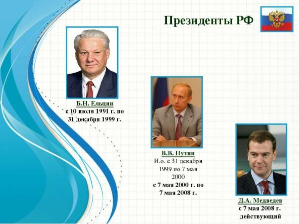 Федерации». Президент – гарант Конституции, прав и свобод человека и гражданина. Президента нашей страны избирают всенародным голосованием. Выборы проходят один раз в 6 лет. В выборах принимают участие все взрослые (начиная с 18 лет) граждане страны. Президент во время инаугурации (торжественная процедура вступления в должность главы государства) положив руку на Конституцию, клянётся служить своему народу. Дети назвали имя первого президента РФ ( Бориса Николаевича Ельцина), вспомнили, кто был президентом РФ в 2008 году ( Дмитрий Анатольевич Медведев ), и, конечно, все присутствующие назвали имя действующего президента Владимира Владимировича Путина.