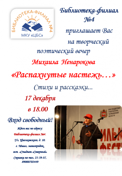 17 декабря (вторник) библиотека-филиал №4 приглашает всех желающих на творческий поэтический вечер Михаила Ненарокова «Распахнутые настежь…». Начало мероприятия в 18:00.
