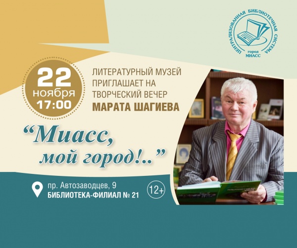22 ноября в 17.00 в литературном музее пройдёт творческий вечер миасского поэта и прозаика Марата Шагиева.