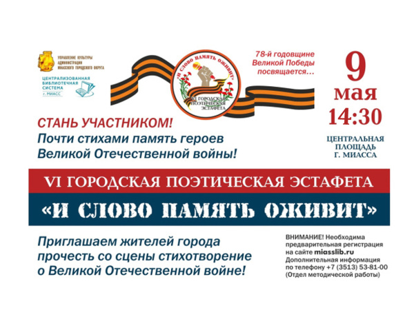 Уважаемые миассцы! Приглашаем вас принять участие в VI городской поэтической эстафете «И слово память оживит…». Внимание! Изменилось время поэтической эстафеты — начало в 14.30. Эстафета начнется 9 мая на площади перед зданием городской администрации. Участникам нужно будет зачитать стихотворение (или отрывок из произведения) о Великой Отечественной войне. Чтецы будут передавать …