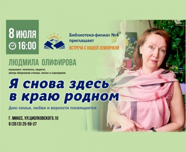 Библиотека-филиал № 4 приглашает на встречу с нашей землячкой Людмилой Олифировой, поэтессой, музыкантом, педагогом, автором сборников стихов, песен и сценариев. Она давно живет и работает в Москве, но всегда с удовольствием приезжает в родной город и встречается с друзьями и почитателями своего таланта! Встреча пройдет 8 июля (пятница) в 16 …
