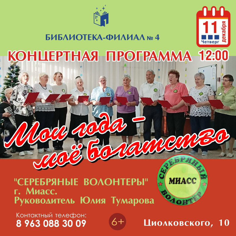 11 декабря (четверг) в 12-00 библиотеке-филиале №4 (ул. Циолковского, 10) «Серебряные» волонтёры города Миасса  представят концертную программу «Мои года — моё богатство»!  «Серебряные» волонтёры – это добровольцы старше 55 лет. Эти активные, жизнерадостные люди,  несмотря на возраст, заряжают энергией и позитивом! Приглашаем всех желающих посетить это незабываемое выступление! Вход свободный!